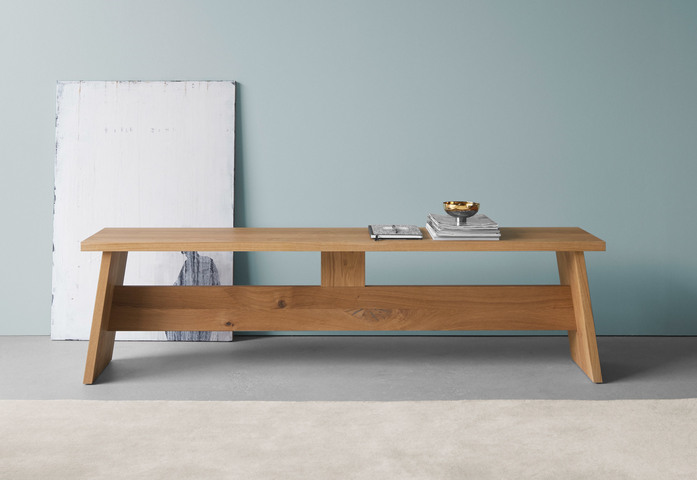 Die Bank FAWLEY zeichnet sich durch ihre lineare Form aus und nimmt so Bezug auf das strukturelle Prinzip des Tisches FAYLAND. Die charakteristische Mittelzarge dominiert den Charakter von Bank FAWLEY und unterstreicht die stabile und elegante Konstruktion. FAWLEY ist in europäischem Nussbaum und massiver Eiche, geölt oder weiß pigmentiert, erhältlich.