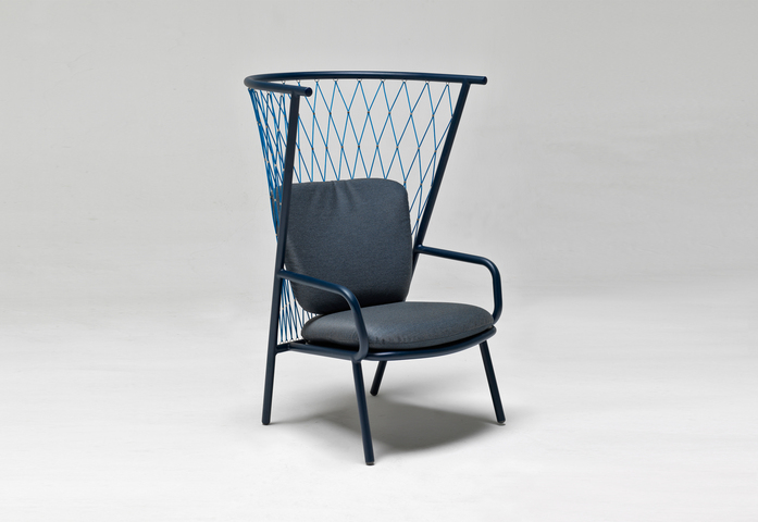Dem Rohraufbau ist mit einer Sitzfläche aus tiefgezogenem Blech versehen. Das Flechtwerk aus Polyesterkordeln, dessen Maschenmuster mittels Stahlklammern aus AISI316-Stahl erhalten wird, verleiht ein natürliche Empfinden von Komfort und Behaglichkeit: Ein Möbelstück von großzügigen Abmessungen, das beschützt und gleichzeitig erlaubt, zu sehen und zu hören. Das Befestigungssystem des Netzes ist innovativ.