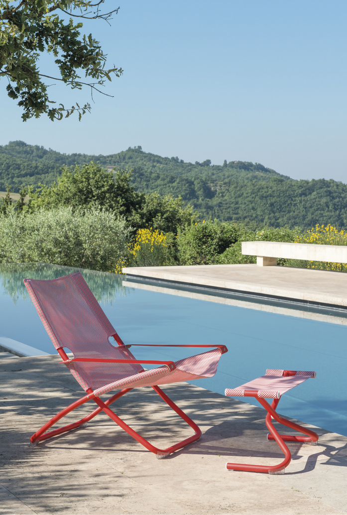Große Abmessungen und eine geschwungene, schmeichelnde Form: Das sind die Eigenschaften von Snooze, dem Entspannungssessel von EMIU. Das Gestell besteht aus Stahlrohr. Man hat die Wahl zwischen 7 Farben, die mit den 7 Stofffarben kombinierbar sind. Sämtliche Metallkomponenten sind durch Kunststoffteile isoliert. Anhand eines ebenso einfachen wie originellen Stellmechanismus der Armlehne lassen sich zwei Positionen einstellen: eine Lese- und eine Ruheposition. Passend zum Liegestuhl, die praktische Fußstütze – in allen angebotenen Farbvarianten – und der Regiesessel, der jetzt durch den zusätzlichen Halt in der Rückenlehne und die neue Sitzpolsterung noch bequemer ist. Neue Farben für 2016.