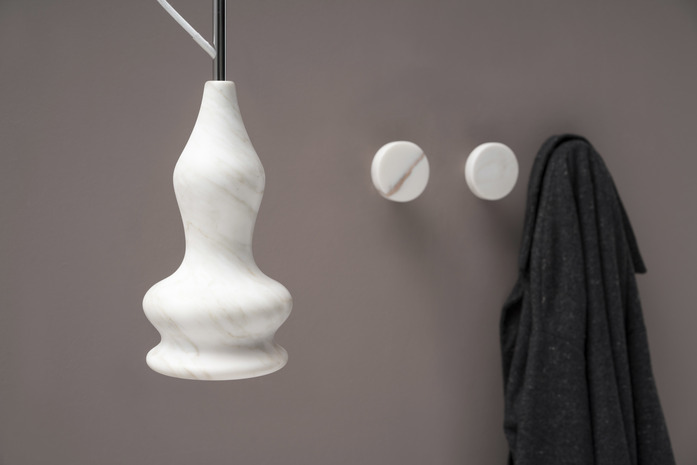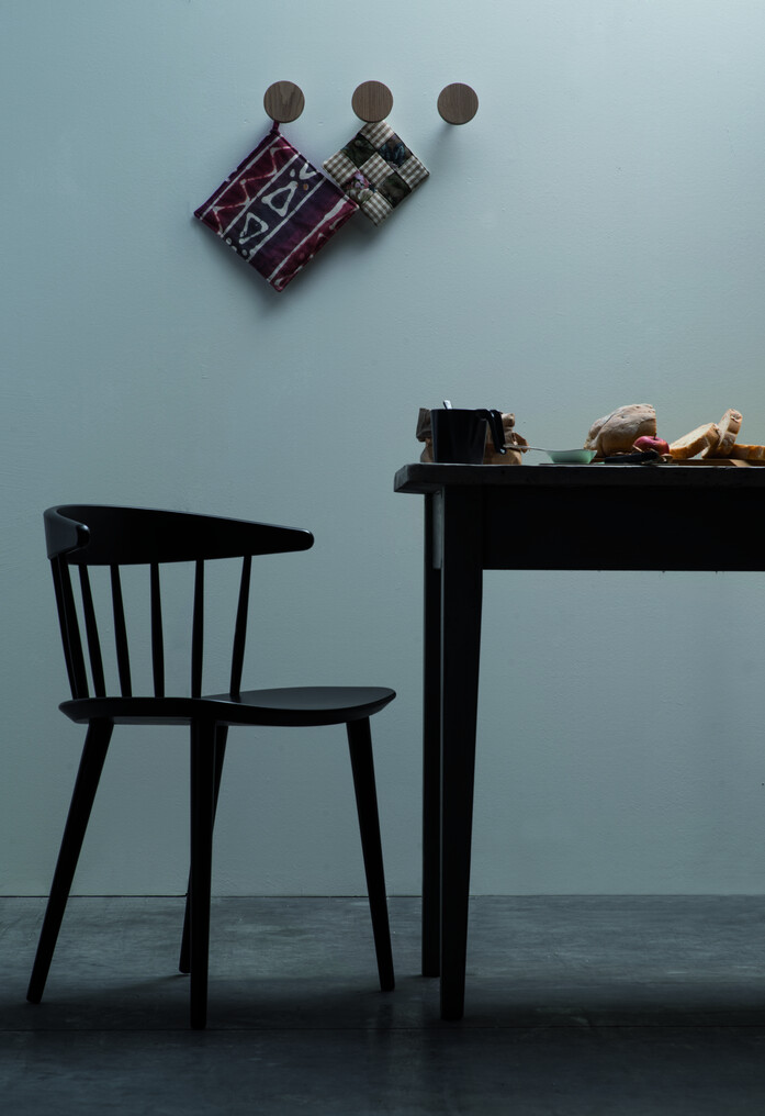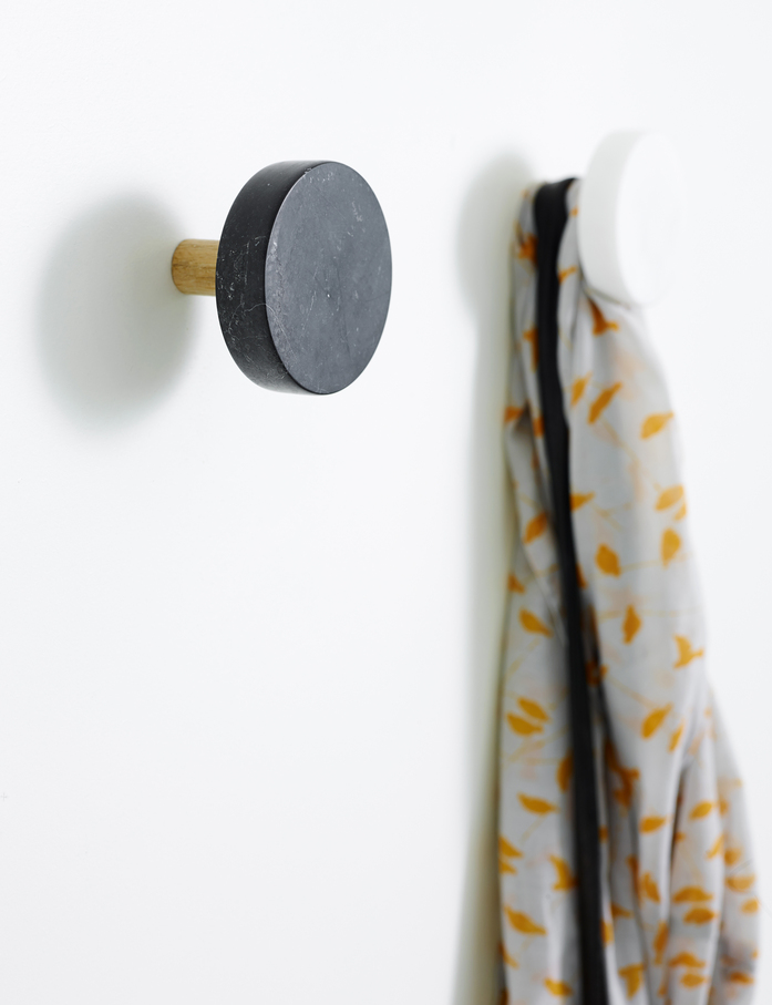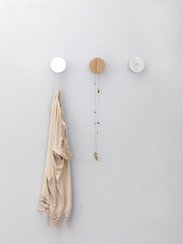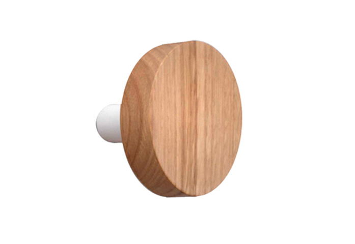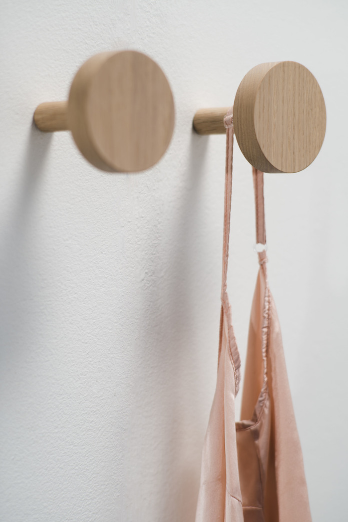 Original wall-mounted hangers available in five different materials with white support. Dots are now available in the new oak edition with oak support.