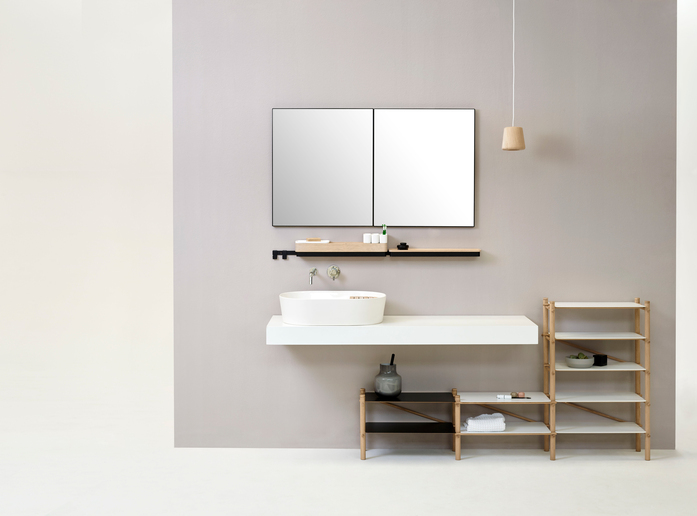 Step is a generous ceramic bathroom basin with a unique feature of two levels inside the sink. The upper level with a removable wooden decking creates a tactile drying surface and storage area for bathroom accessories. Step is available in white and in white inside and grey outside.