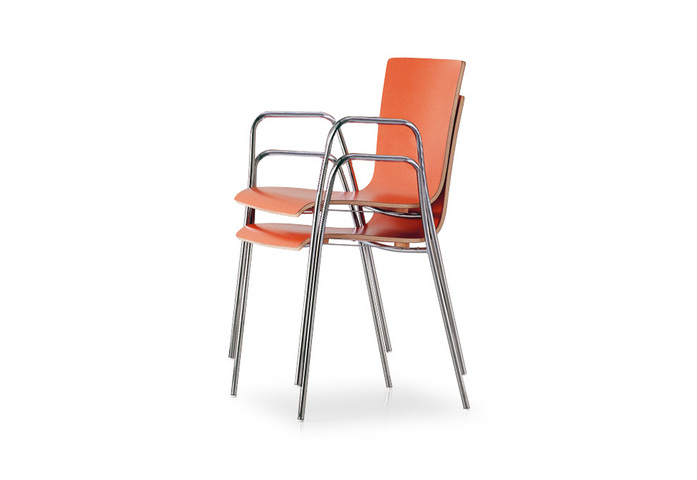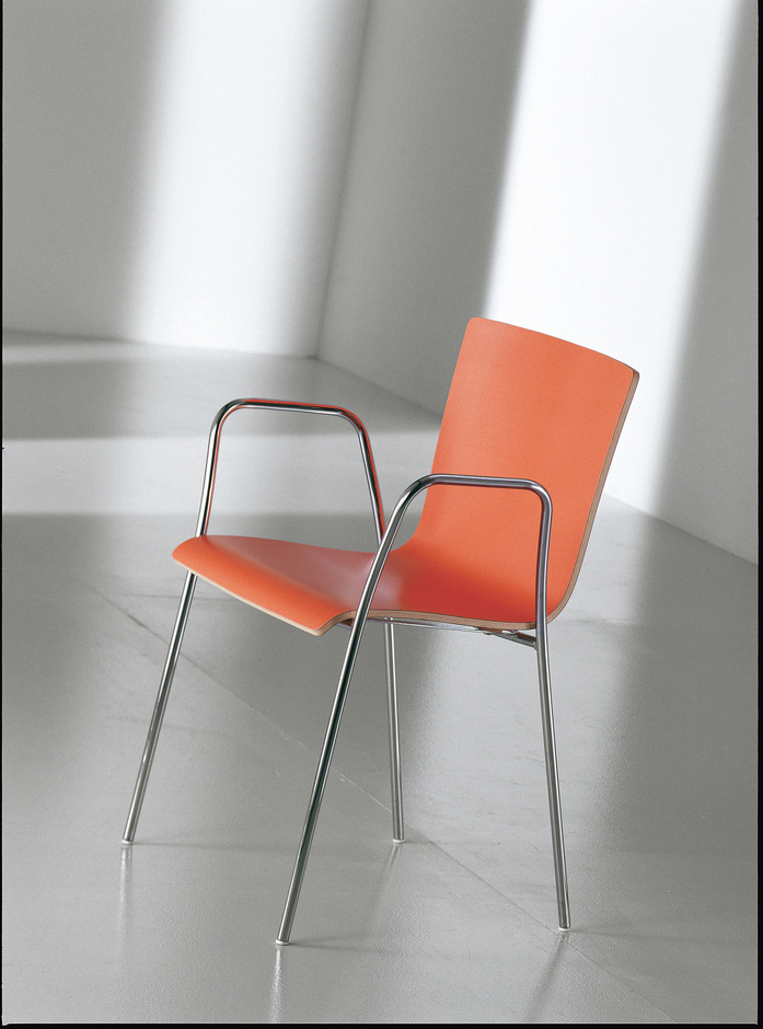 Struktur aus gebogener Sperrholzplatte in Buche, beidseitig mit satinierter Laminatbeschichtung, die in verschiedenen Farben erhältlich ist. Tragende Struktur aus gebogenem Profilrohr, verchromt, Endverschlüsse aus glänzendem Kunststoff. Verfügbar sind zwei Modelle, beide stapelbar.