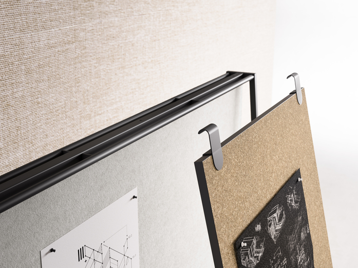The mobile pinboard makes it possible to hold meetings anywhere, and when required, to detach the panel, complete with notes or a moodboard of fabrics, and take it to a different workstation, or hang it on the bookcase for further sharing. Keeping these mobile workers constantly connected, with elegant cable management solutions on all tables, means they are more satisfied and productive, and also that they can shift between different working spaces, from collaborative to social spaces, from open plan to more private areas.