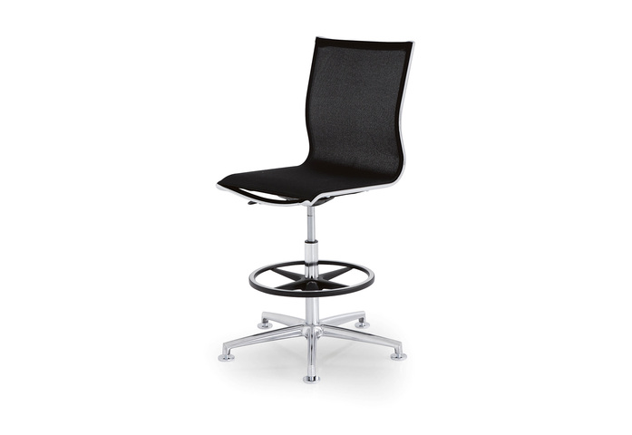 Komfort, Eleganz und Flexibilität, in jedem Sinn: von den harmonischen Formen der Struktur bis zum verchromten Stahl im strahlenden Glanz und der umschließenden, ergonomischen Stütze durch das Netzgewebe. Ein Projekt in vielfältigen Variationen, um den unterschiedlichsten Anforderungen einer Chefetage im Zeitgeist entsprechen zu können.