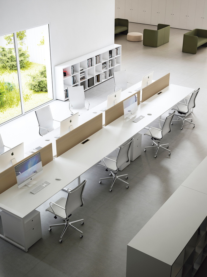 Persönliche Dimension. Das in die Schreibtischplatte integrierte Element, mit dem sich Trennungen und Durchgänge schaffen lassen, trägt zur Organisation von privaten Arbeitsplätzen und kollektiven Räumen bei. Die Höhe ist so ausgelegt, dass die Kommunikation mit Kollegen möglich ist, aber ein Abstand der Diskretion gewahrt bleibt. Das Schrankelement mit Ausstattung kann Dokumente und Korrespondenz aufnehmen, sowie herausnehmbare Box aus Plexiglas, um persönliche Dinge oder Arbeitsunterlagen mit sich zu führen.
