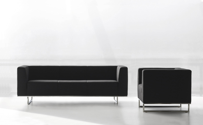 Sofa und Fauteuil für kollektive Räume, mit minimalistischen Volumen, bodenfrei auf einem äußerst widerstandsfähigem Stahlrohrgestell, Ausführung verchromt. Die Struktur aus Mehrschichtholz mit elastischen Sitzgurten garantiert natürlichen Komfort. Der Bezug kann aus Stoff, Leder oder Ökoleder sein.