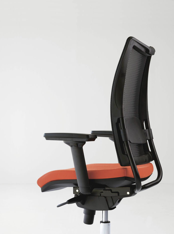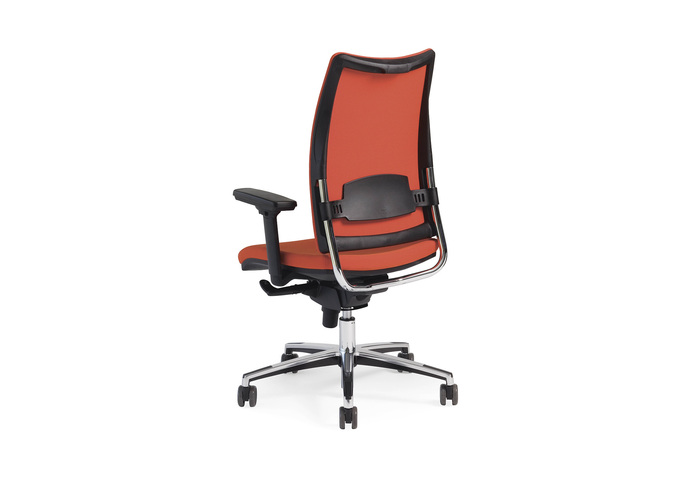 Ergonomie wird in der Ausführung mit dem Sitz mit Stoffbezug und Nähten auf Sicht noch günstiger. Das Fußkreuz mit Rollen kann aus Druckguss-Aluminium oder widerstandsfähigem Kunststoff sein.