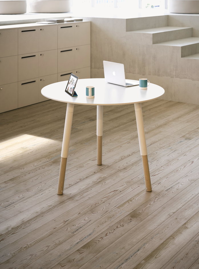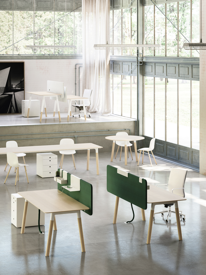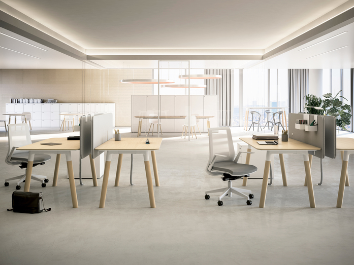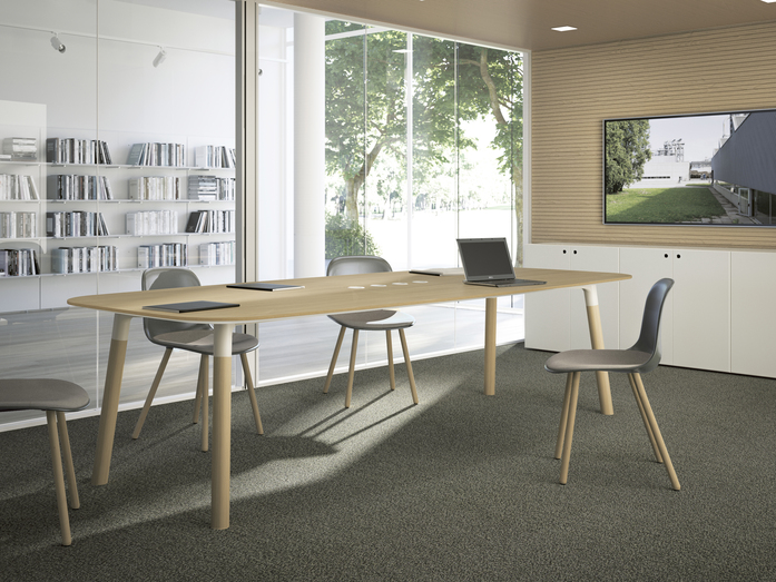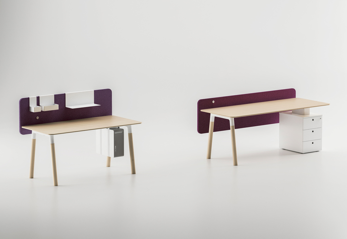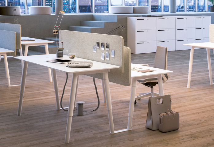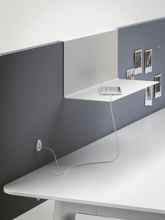 The table's electrical connections are hidden under the top, while the modesty panel can be fitted with storage accessories and with a USB socket for recharging electronic devices.