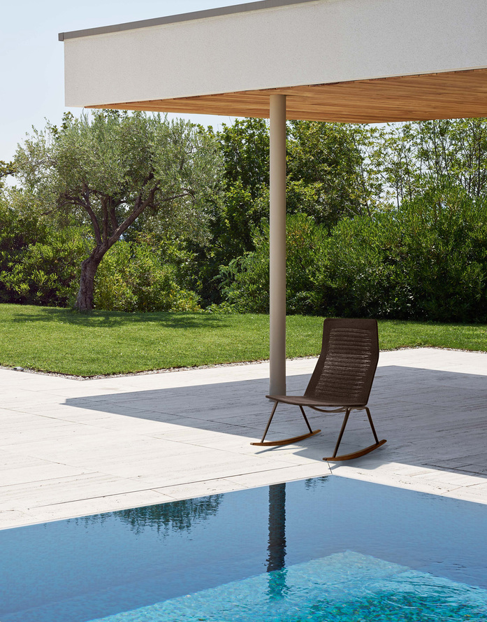 Diese Kollektion ist für den Außenbereich gedacht und besteht aus einem Lounge-Sessel, zwei Lounge-Sesseln mit hoher Rückenlehne - einer davon mit einem abnehmbaren Iroko-Beistelltisch - und einem Schaukelstuhl. Die Lounge-Sessel mit hoher Rückenlehne und die Schaukelversion können dank eines speziellen Kopfstützenkissens noch komfortabler gestaltet werden.