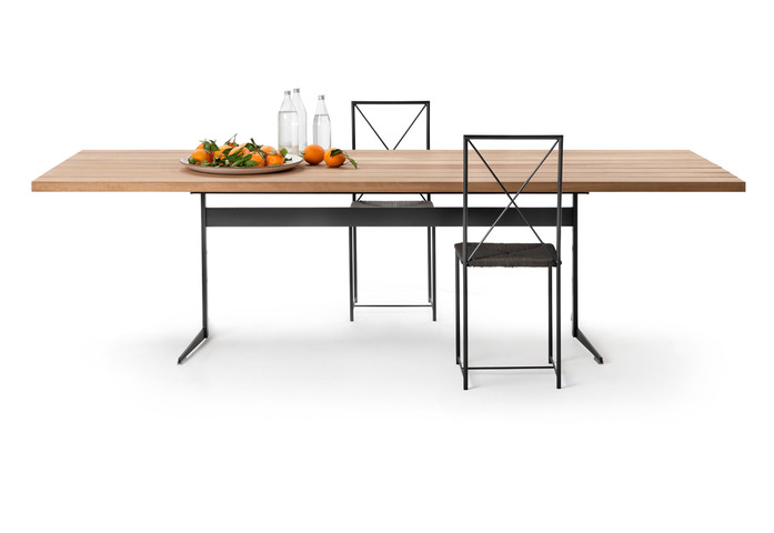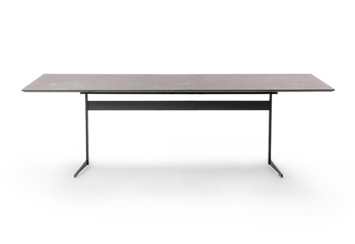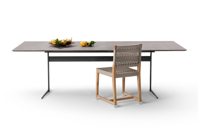 Das Gestell vom Tisch Fly Outdoor besteht aus Chrom-Nickel Stahl und ist auch mit Pulverbeschichtung in den Farben Weiß, Kaki, Weinrot und brüniert erhältlich. Die runde oder rechteckige Tischplatte in verschiedenen Größen besteht aus eleganten Steinen, die für den Außenbereich geeignet sind, und ist in der Ausführung aus grauem Beola, Lavastein, Cardoso und Porphyr erhältlich. Den rechteckigen Tisch gibt es auch mit einer Tischplatte aus Latten aus massivem Iroko, verfügbar in den Ausführungen Natur und Grau oder Weiß gebeizt.