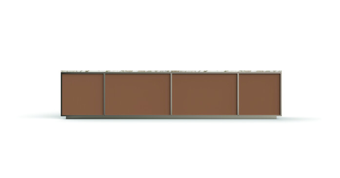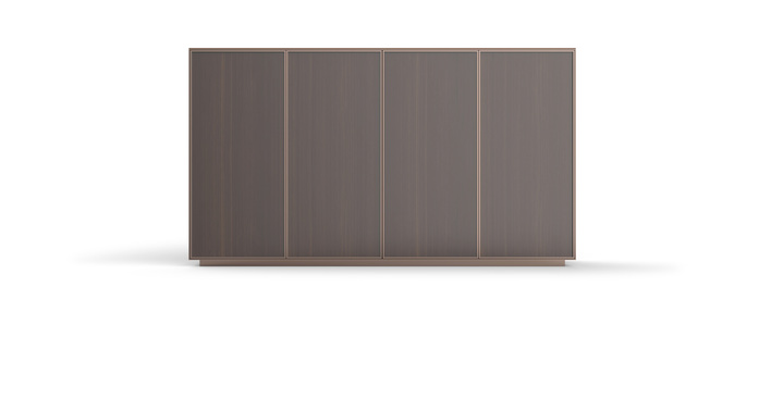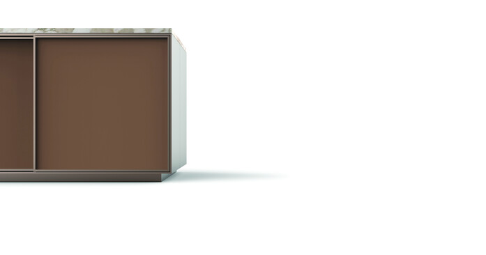 The family is composed of different cabinets for the living area with a light aluminium structure, enhanced by large sliding doors in wood or covered in cowhide, with a groove grip. The tops are available in marble or wood. The collection includes a functional TV cabinet with two sliding doors and two hinged doors, a cabinet with two sliding doors and a buffet with four hinged doors. Pieces of great personality and extreme functional quality. Painstaking care has also gone into the internal, totally concealed hinges. The cabinets have the same finish on the front and back, making them ideal for placement at the center of a room.