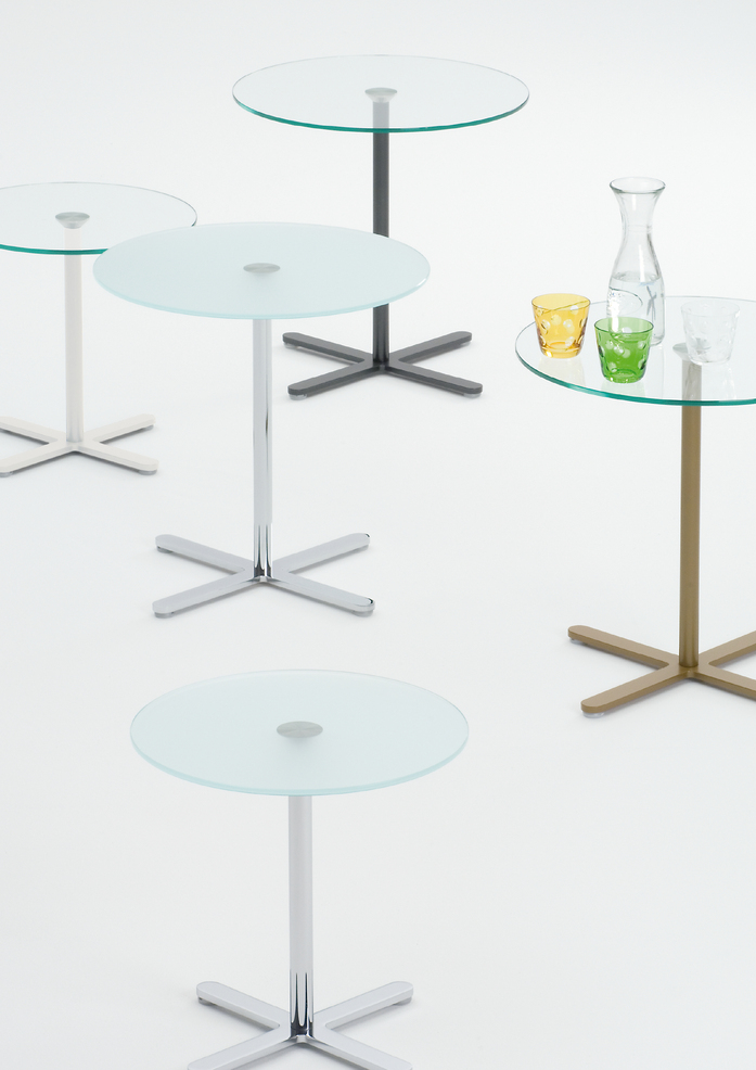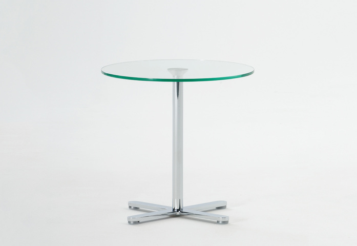 Die Beistelltischversion mit Metallfuß und Tischplatte in Glas, hohe Standfestigkeit durch entsprechend großen Kreuzfuß. Für Wohnung, auch sehr gut geeignet für Hotel und Objekt.