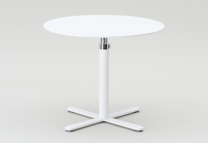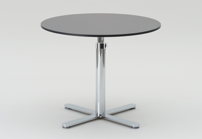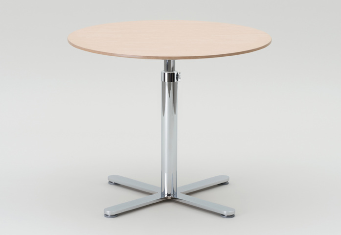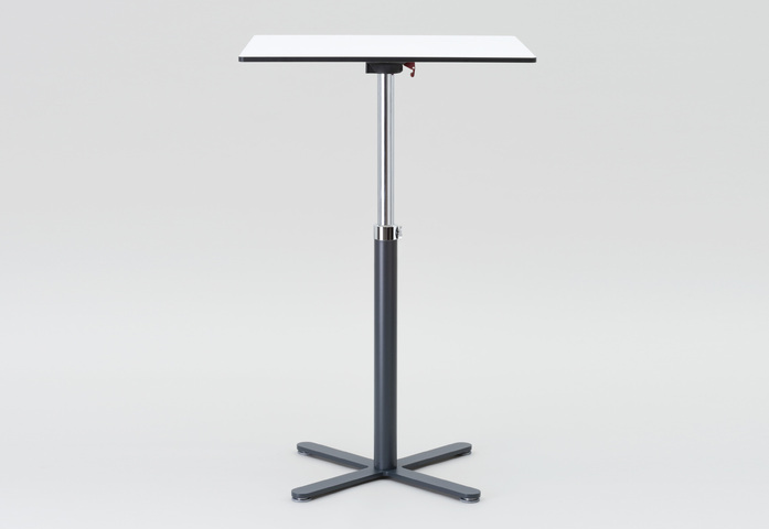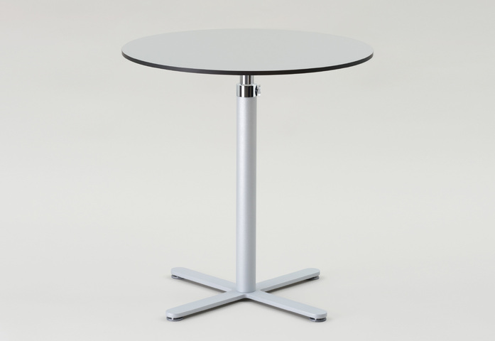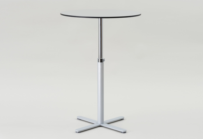 Einsäulentisch, in Design und Funktion einzigartig und unverwechselbar, mit mechanischer Höhenverstellung im Raster von 20 mm, ohne Gasdruckfeder, ohne Auslösehebel. In den letzten Jahren mehr als 1000 mal verkauft. Einfach und sicher in der Bedienung mit weiterentwickeltem Führungsadapter und zusätzlichem Feststellknebel für noch mehr Funktionssicherheit. Hohe Standfestigkeit durch Kreuzfuß mit nivellierbaren Fußgleitern (System FORMvorRAT). Der Tisch für alle Einrichtungsanforderungen.