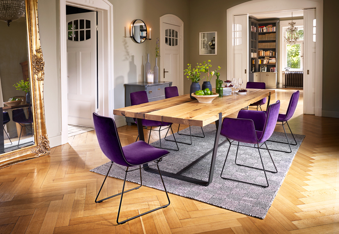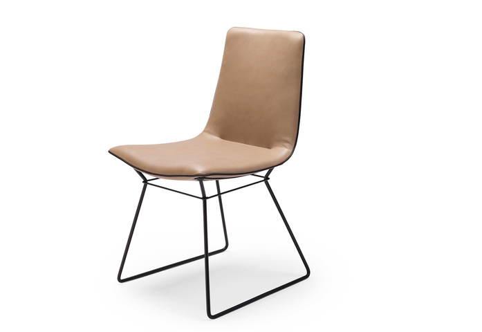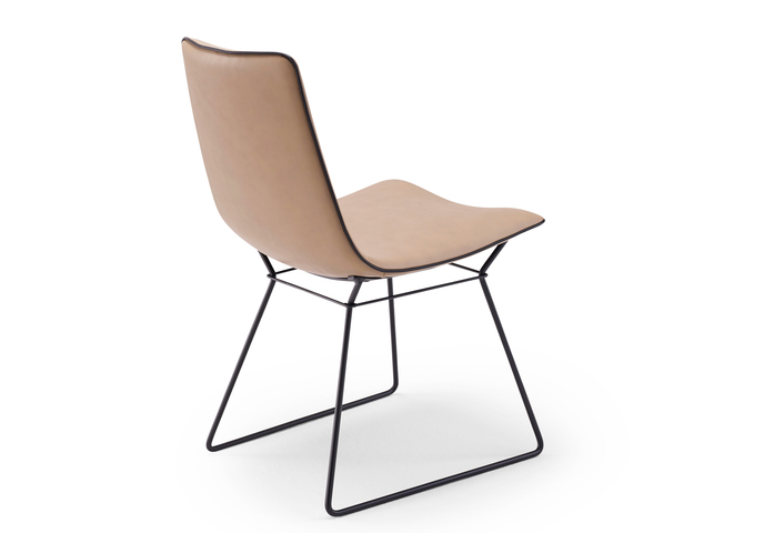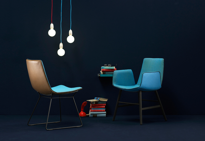 Die vollgepolsterte Sitzschale wird mit wertvollen Stoffen oder elegantem Leder bezogen, wobei sich die Bezugmaterialien der Vorder- und Rückseite individuell kombinieren lassen. Das Gestell kann ebenfalls nach dem persönlichen Geschmack gewählt werden: Elegantes Eichenholz, gebeizt in verschiedenen Farben oder grazile Stahlgestelle, pulverbeschichtet. Unterstrichen wird die konsequente Linienführung des Designs durch einen Keder, der die Form der Sitz- und Lehnflächen optisch abrundet.