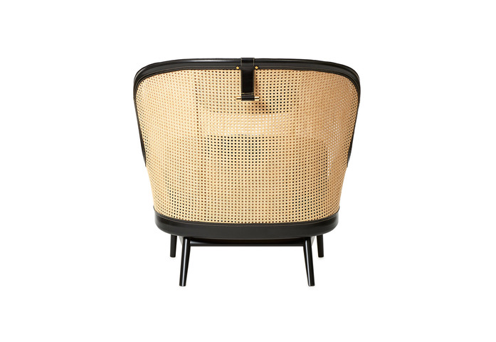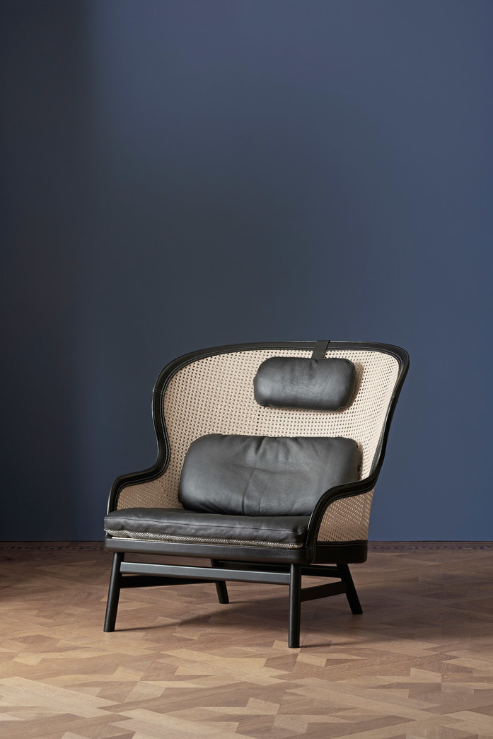 Easy chair with stand in beech or oak. Back in rattan, lined with leather. Neck cushion and frame in Tärnsjö leather, cognac or black. Lumbar and seat cushion in leather (8175 black, 8695 cognac) or fabric Lewis of Bute. Lewis col. 0112, 1310, 0118 or 1610.
