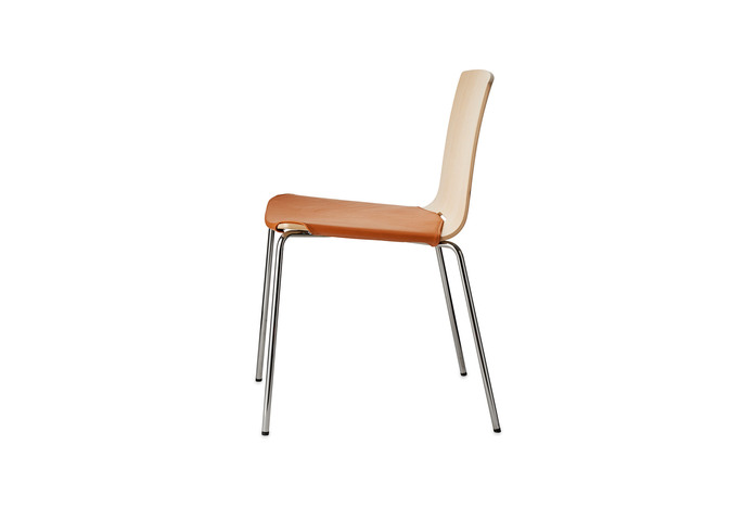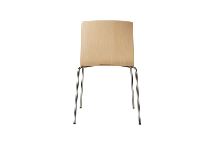 Stacking chair in natural ash, birch or oak veneer. Optional armrests. Frame in chrome. Also available with removable seat- and back cushion. Felt glides.