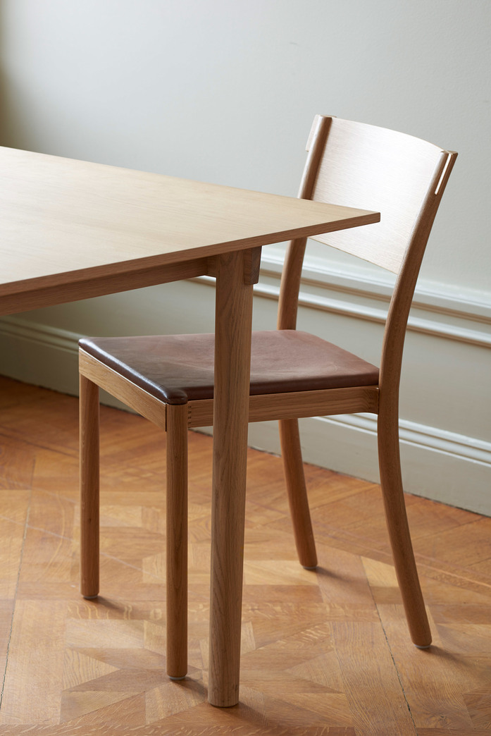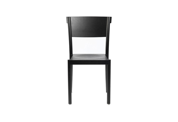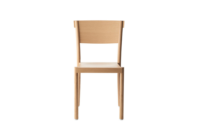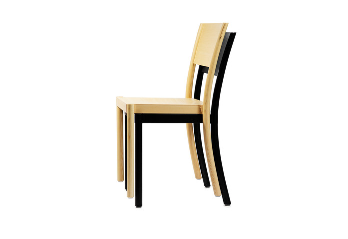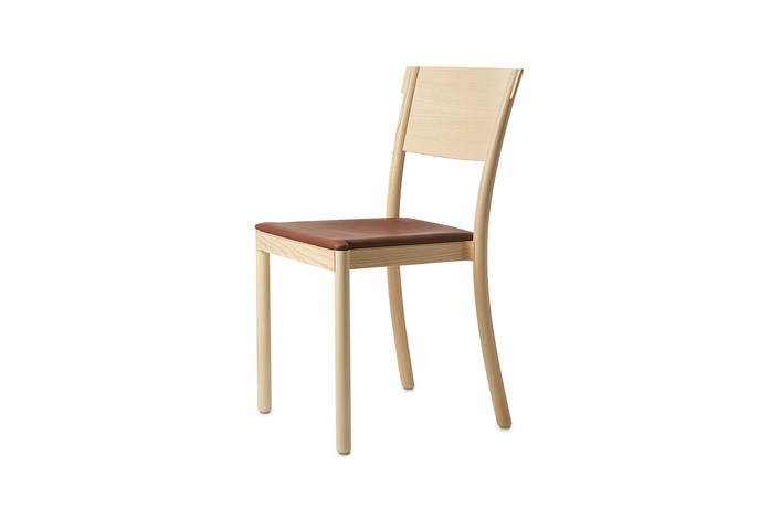 Chair in natural ash, beech or oak, stain or lacquer. Back and seat in veneer or upholstered seat/back and seat in fabric or leather. Stackable and suspendable. Available with sound-absorbent material under the seat. Approved by Möbelfakta – quality, environment and social responsibility, certificate no. 0320130909.