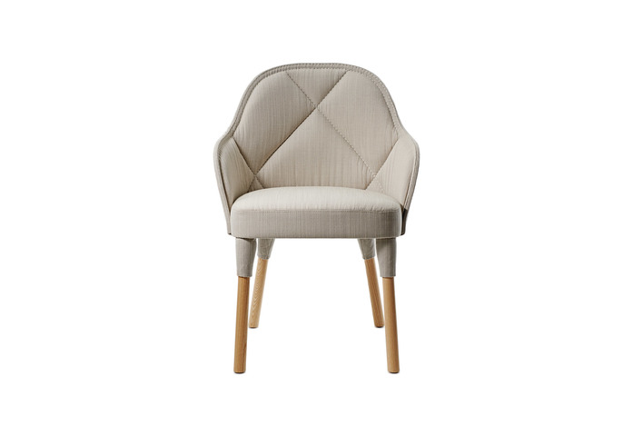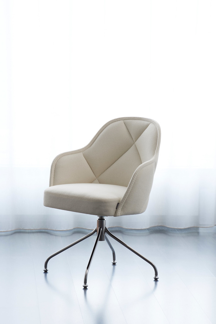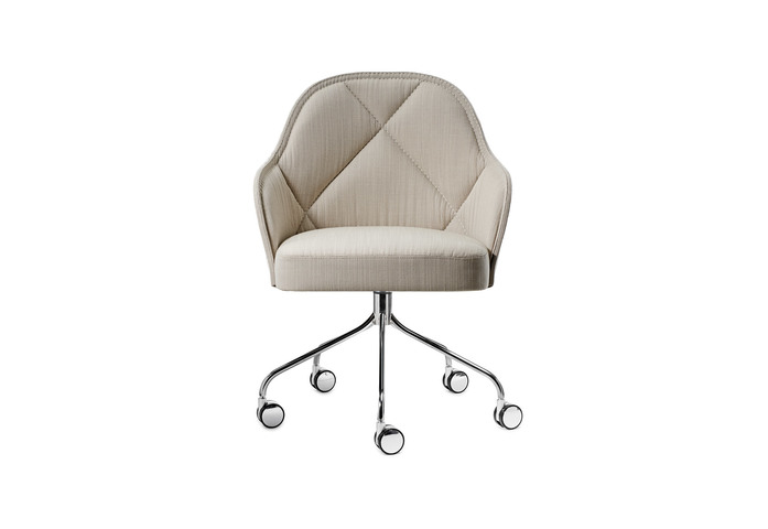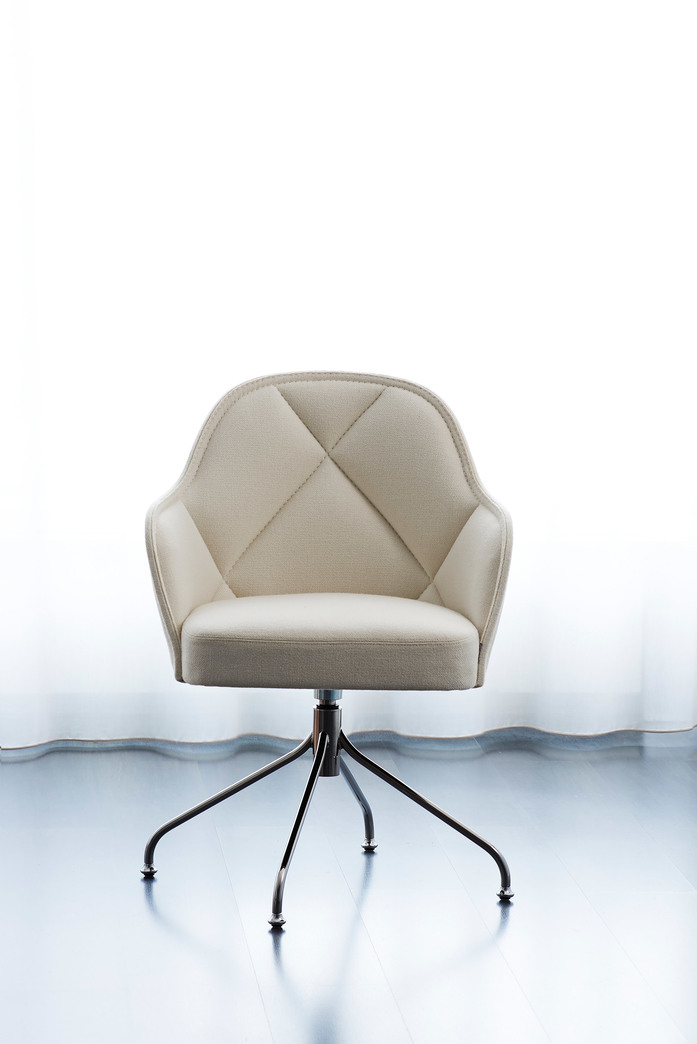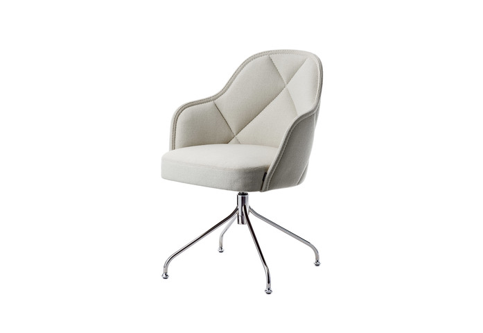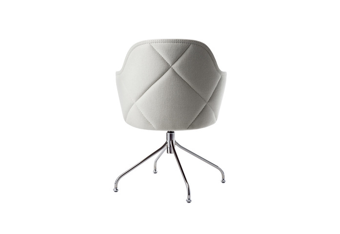Armchair with upholstered back and seat, tailored with backrest perforations. Thread in black, orange, green, brown, dark grey, light grey or off-white. We recommend fabrics with stretch and wool fibres. Four-legged swivel base with plastic glides, or alternatively five-legged swivel base and casters, with fixed or adjustable height. Also available in four-legged wood in ash or oak.