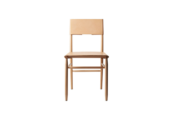 Chair in natural beech. Backrest and seat in veneer or in leather. Available colours are natural, black or brown leather.