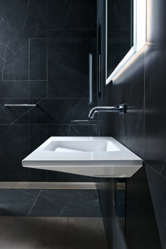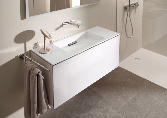 Die Waschtischarmatur Geberit ONE ist in zwei Ausführungen erhältlich: in geometrisch klarem Design sowie in organisch-abgerundeter Optik. Beide Varianten sind optimal auf die Größe der Geberit ONE Waschtische abgestimmt. Die Keramik wird dadurch optimal ausgespült. Zu bedienen sind die Armaturen mit symmetrischen Drehknöpfen beziehungsweise Hebeln beidseits des Armaturenkörpers. Damit kann der Nutzer Wasservolumen sowie -temperatur intuitiv regeln. Die Wandarmatur sorgt dafür, dass der ganze Waschtisch frei bleibt. Auch bei der Reinigung bietet sie Vorteile, da Schmutzkanten, die sich vorzugsweise um eine Standarmatur bilden, verhindert werden. Die Position der Wandarmatur ist dabei vordefiniert: Das Installationselement für den Waschtisch ist mit einer höhenverstellbaren Traverse bestückt, auf der der Armaturensockel aus Messing fest verankert wird. Damit lässt sich die Installation schnell, fehlerfrei und dauerhaft solide ausführen und die Armatur präzise auf den Waschtisch ausrichten.