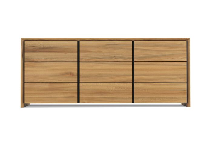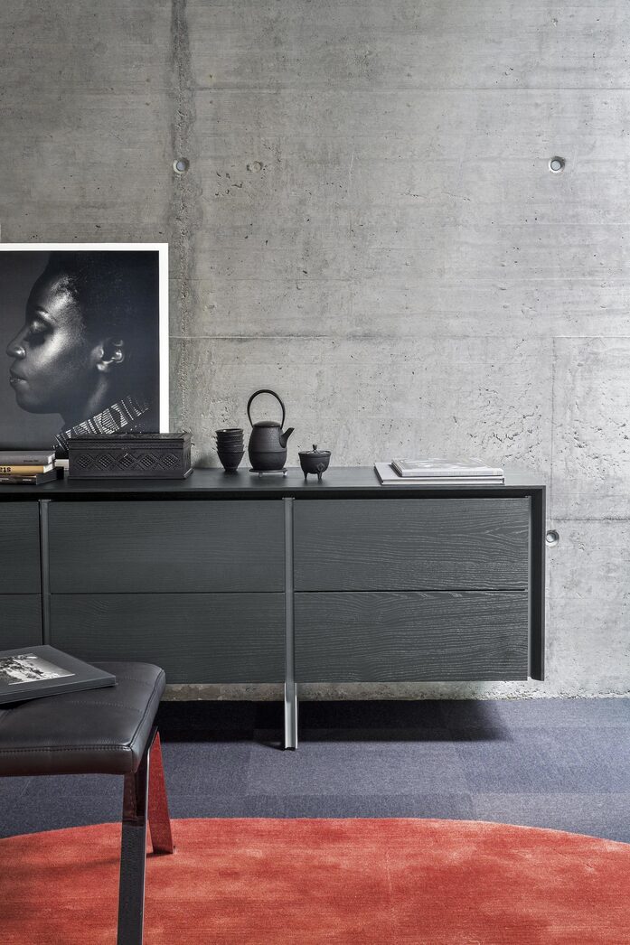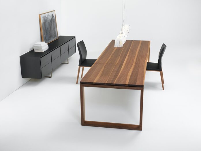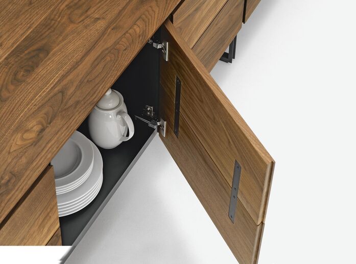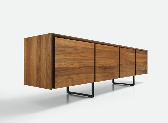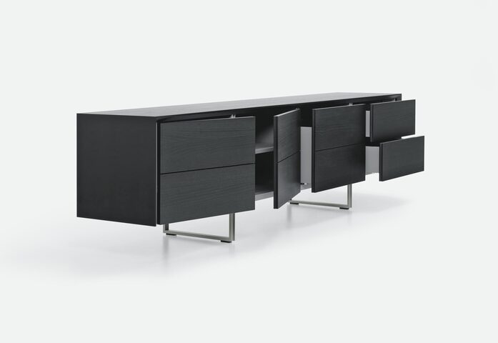 Nach aussen präsentiert sich ENNA schlicht, mit klaren Linien und Flächen. Sein ruhiges Erscheinungsbild verdankt das Sideboard der gleichmässigen Rasterung der Front, deren Struktur durch U-Profile aus Rohstahl gebildet wird und an architektonische Formen erinnert. Besonders reizvoll und elegant wirkt die Ausführung, bei der Stefan Westmeyer die U-Profile in Kufen auslaufen