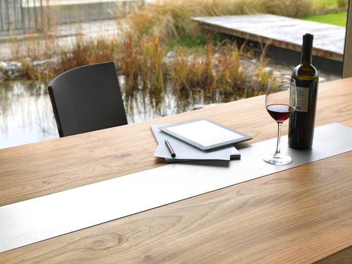 Den Mittelpunkt des Tischblatts bildet ein warm gewalztes Stahlblech. Bei einer Tischlänge von 220 cm ist das Blech 100 x 20 cm gross, bei anderen Formaten passt sich die Länge entsprechend an. Die Optik dieses Blechs passt hervorragend zum Betonsockel des Tisches und auch zum CNS-Material anderer Girsberger Möbel. Das Material, das im Küchenbau verwendet wird, zeichnet sich durch eine edle, matte Ästhetik und eine extreme Widerstandsfähigkeit aus. Heisse Töpfe oder offene Weinflaschen können bedenkenlos darauf platziert werden.