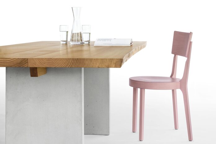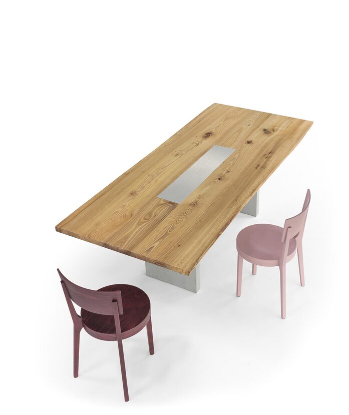 Nur besteht aus herznahen Massivholzbrettern, einer Einlage aus CNS-Blech und nach innen versetzen Betonsockeln. Ein prägnantes Detail ist die Naturbaumkante an der Tischaussenseite. In der Tischmitte sind die Bretter gerade geschnitten und mit einem zusätzlichen 20 cm breiten Brett verbunden.