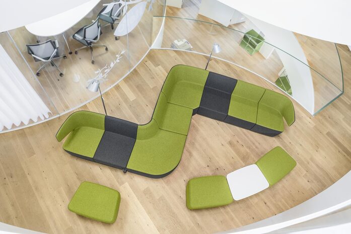 Mit Pablo Modular können Sitzlandschaften in nahezu jeder Form gebildet werden. Der planerischen Fantasie sind kaum Grenzen gesetzt. Und dies mit wenigen Elementen: Endmodule mit Armlehnen, lineare Zwischenelemente sowie positive und negative Eckelemente können beliebig miteinander verbunden werden. Ein einfacher Verkettungsmechanismus sorgt dafür, dass die Module passgenau aneinander anschliessen. Die modulare Bauweise ermöglicht es, die Form der Sitzgruppen einfach und schnell zu ändern. So kann Pablo jederzeit neuen Situationen im Büro angepasst werden. Darüber hinaus lassen sich die Module mit allen anderen Pablo Modellen kombinieren. Zur Wahl stehen Sessel, Zweisitzer und Hocker sowie ein Beistelltisch und ein Arbeitstisch.