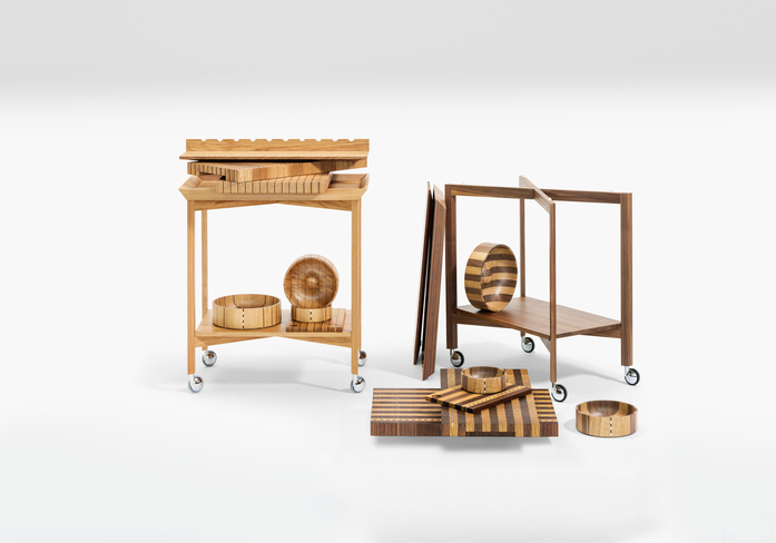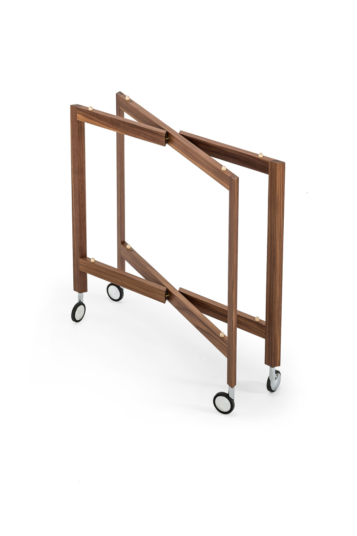 Mit dem Serviertablett, das exakt auf den zusammenklappbaren Servierwagen aus Eiche oder Nussbaum passt – entsteht ein funktionales Kleinmöbel. Wird es nicht gebraucht, kann es platzsparend verstaut werden.