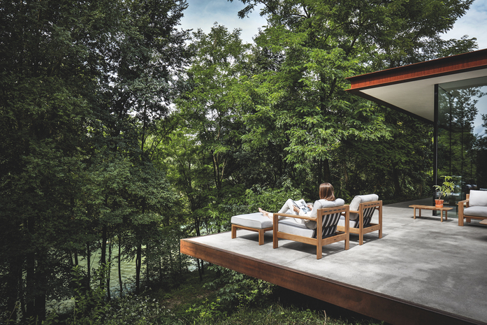 Die vollständige Kollektion besteht aus einem Sessel, einem Ottomanen, einem 2-Sitzer- und einem 3-Sitzer-Sofa und wird durch einen Couch- und einen Beistelltisch mit gelatteter Tischplatte ergänzt. Teakrahmen und luxuriöse Kissen werden von teilweise elastischen Gurtbändern für draußen gestützt, die in 3 Farbvarianten verfügbar sind: Cadet, Charcoal und Pebble.