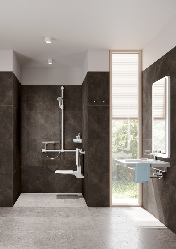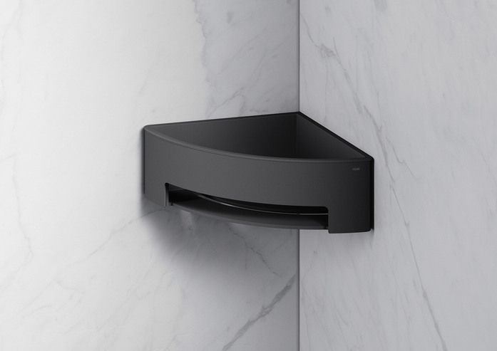 Duschkorb Ecklösung System 900 - zur Wandmontage - Halter aus hochwertigem Edelstahl, pulverbeschichtet in der HEWI Farbe CV (Schwarz tiefmatt) mit Einsatz aus hochwertigem Kunststoff in der HEWI Farbe 90 (Tiefschwarz) oder pulverbeschichtet in den HEWI Farben AS (Weiß tiefmatt), AX (Hellgrau Perlglimmer tiefmatt) und CD (Dunkelgrau Perlglimmer tiefmatt) mit Einsatz aus hochwertigem Kunststoff in der HEWI Farbe 98 (Signalweiß) - 67 mm hoch, Schenkellänge 170 mm - inklusive korrosionsfreiem HEWI Befestigungsmaterial