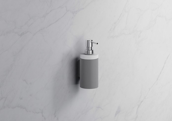 Seifenspender mit Halter System 900 - für den Einsatz am Waschtisch geeignet - zylindrischer Wandhalter - Halter aus Metall, pulverbeschichtet in der HEWI Farbe CV (Schwarz tiefmatt) mit Seifenspender aus schwarz mattem Polyamid oder pulverbeschichtet in den HEWI Farben AS (Weiß tiefmatt), AX (Hellgrau Perlglimmer tiefmatt) und CD (Dunkelgrau Perlglimmer tiefmatt) mit Seifenspender aus weiß mattem Polyamid - Halter innen mit Schutzfolie für eine sichere, definierte Position und gegen Beschädigungen des Einsatzes - 180 mm hoch, 85 mm tief, Durchmesser 70 mm - Pumpenkopf hochwertig verchromt - Füllmenge ca. 200 ml - zur Wandmontage, verdeckte Befestigung - inklusive korrosionsfreiem HEWI Befestigungsmaterial