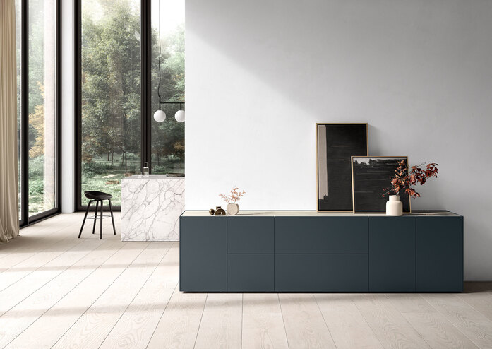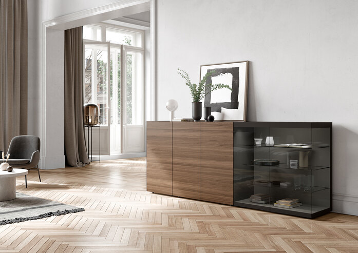 Ob Lowboard, Sideboard, Vitrine, hohe Stauraum-Möbel oder ausgefallene Solitäre: Verschiedene Untergestelle und Rundfüße, zusammen mit der grafischen Planungsphilospohie und mehr Maßen passen die Wunschkreation jedem Raum individuell an.