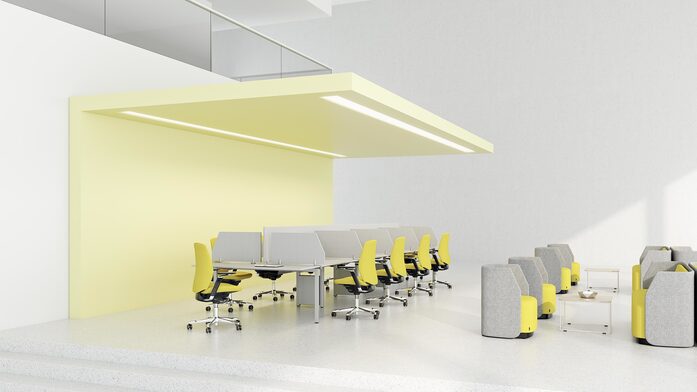 Die Art und Weise, wie wir leben und arbeiten, verändert sich rasant: Digitalisierung, neue Geschäftsmodelle, neue Bedürfnisse und Anforderungen der Mitarbeiterinnen und Mitarbeiter. Die Experten vom Fraunhofer Institut für Arbeitswirtschaft und Organisation (Fraunhofer IAO) geben dem so genannten Multispace-Büro, der offenen Bürolandschaft, die besten Chance, die prozessualen und kommunikativen Herausforderungen der neuen Arbeitswelt zu meistern. In der offenen Bürolandschaft lassen sich alle Facetten der Arbeit abbilden: Teamarbeit oder ungestörte Einzelarbeit, Rückzug oder Kommunikation, Kreativmeetings und klassische Besprechungen. Fields ist speziell für diese neue Arbeitswelt entwickelt worden. Mit dieser Serie kann man gemeinsam genutzte Arbeitsumgebungen, Meeting-Bereiche, Raum-in-Raum-Lösungen, Besprechungssituationen oder individuelle Arbeitsplätze schaffen. Mit dem umfangreichen Sortiment und der großen Auswahl an Farben, Materialien und intelligenten Accessoires lassen sich zukunftsfähige Bürowelten gestalten.
