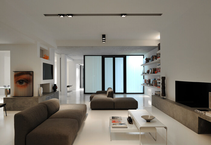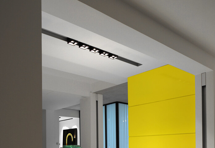 kreon prologe in-line Licht gibt einem Volumen Tiefe und Form: Vorgefertigte Aluminiumprofile werden hier in verputzten Oberflächen-Öffnungen angebracht, darin die Lichtelemente integriert. Die kreon prologe in-dolma Leuchtengehäuse ragen etwas aus dem eloxierten Aluminiumprofil hervor, das in die Oberfläche integriert ist. Dadurch wird die Decke in eine flexible und skulpturale Lichtlandschaft verwandelt. Die Profile werden den individuellen Wünschen und Entwürfen angepasst. Sie sind auf Maß gefertigt und stets vorverkabelt. Die Einbaugehäuse sind matt schwarz oder weiß pulverbeschichtet.