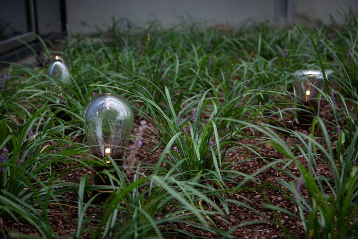 Mundgeblasenes und in Handwerkskunst gestaltetes Glas ist nicht das typische Material, mit dem kreon assoziiert wird. Dabei hat Glas vielseitig verwendbare Eigenschaften. Geblasen, gepresst, geschnitten, sandgestrahlt oder versilbert ist es ein modernes, ausdrucksstarkes Material. Die neuen Gartenleuchten sind Ausdruck dieser organischen Glaseigenschaften – sie sind wertvolle Skulpturen, geformt von den Händen erfahrener Glasbläser. Dafür wird Luft in heißes, noch formbares Glas geblasen um zu einem schwarz schimmernden Glaskörper anzuwachsen. Illuminiert durch eine gläserne Lichtspirale mit satinierter Spitze im Inneren, wird dieses Unikat zur faszinierenden Gartenleuchte. Auch diese einzigartigen Glasobjekte fügen sich – analog den Licht-Prinzipien Qualität, Design und architektonische Integration – in die Natur des Gartens ein.