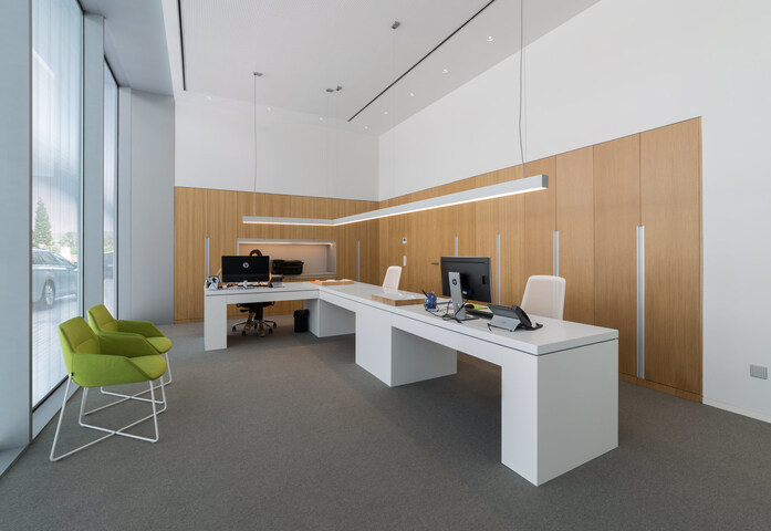 In der 3000 Quadratmeter großen Anlage findet man KRION®, den Mineralwerkstoff der Gruppe PORCELANOSA, der von der Firma Fusteria Mira zu zahlreichen Anwendungen verarbeitet wurde: Rezeption (6901 Black Metal), an mehreren Waschtischen der Badezimmer (1100 Snow White), Tische für über 100 Arbeitsplätze (1100 Snow White), Schubladenschränke (6905 Ash Grey), Direktionsschreibtisch (6901 Black Metal), Theken in den Ruhezonen (1100 Snow White), Konferenztische (1100 Snow White) und verschiedene Anwendungen in den Bereichen Möblierung und Verkleidung.