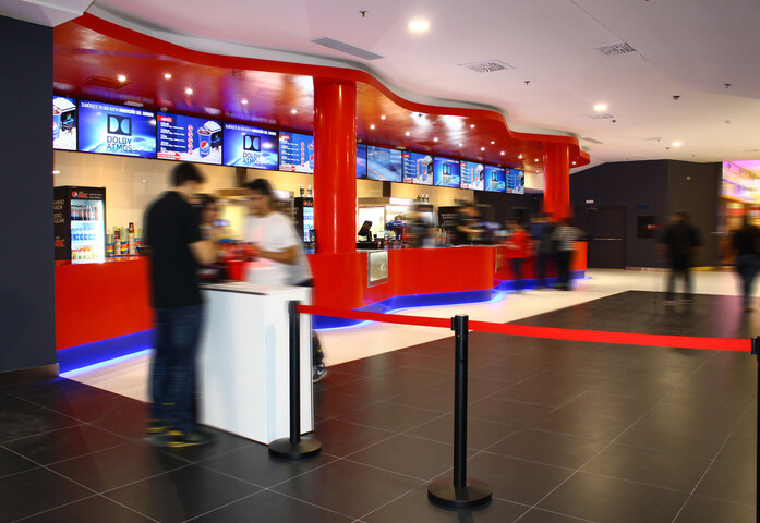Saavedra Arquitecto wusste einige der Eigenschaften, die der Mineralwerkstoff der PORCELANOSA-Gruppe zu bieten hat, auszunutzen, und das Verarbeitungsunternehmen von KRION®, Grupo Damare, hat die spektakuläre Theke in der Bar des Großkinos mit großem Geschick bearbeitet: ein 21 Meter langer Tresen in der Farbe 6405 Happy Red, abgeschlossen mit einer Sockelleiste in 6704 Navy Blue. Damare hat ebenfalls mit KRION® die zwei Säulen mit einem Durchmesser von 60 cm und einer Höhe von 3 Metern verkleidet. Das Thermo-Biegen der Bauteile war das Aufwändige an dieser Arbeit, die dem Ganzen diesen besonderen Charakter verleiht, den das hochmoderne Multicines Odeon Sambil sucht.
