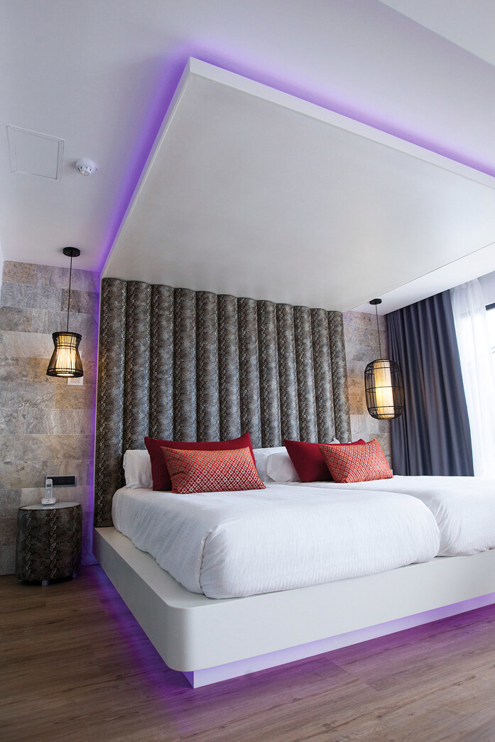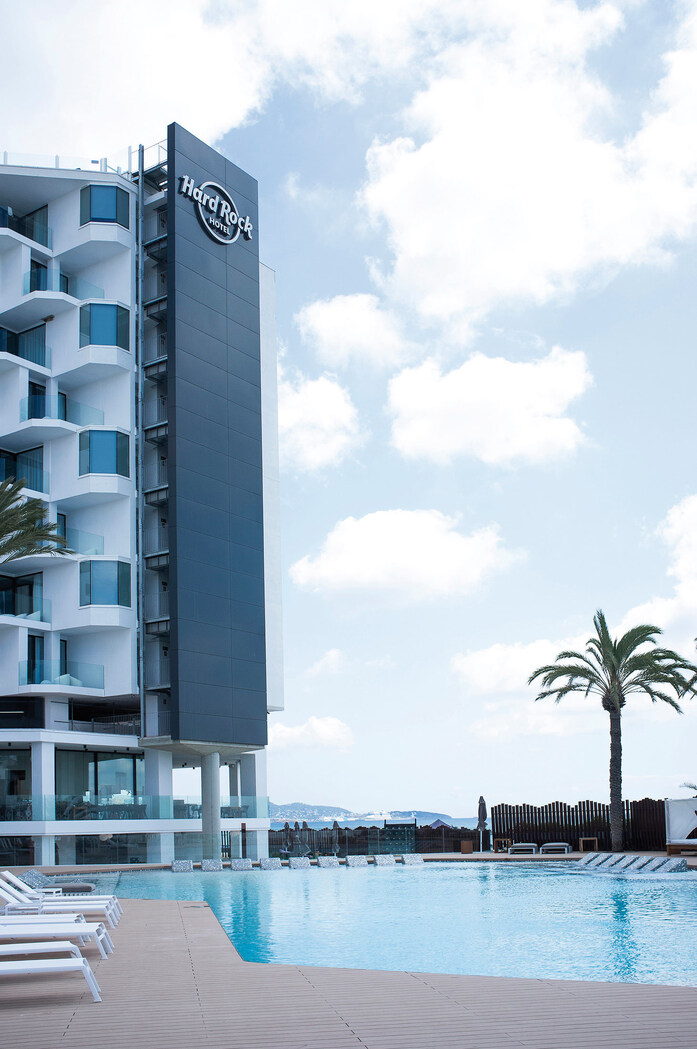On Playa d’en Bossa, one of the most Premium locations of the island (as Abel Matutes Prats, Director General of Palladium Hotels, part of the Matutes business group, tells us), we find the new Hard Rock Hotel Ibiza, based on the structure of the former Don Toni hotel, and completely remodelled. The hotel has 493 rooms, and 14 bars and restaurants (notably the Estado Puro tapas bar and the Sublimotion gourmet restaurant), more than 14 common areas, 12 types of room, a convention hall for 700 people and a large terrace on the 9th floor.