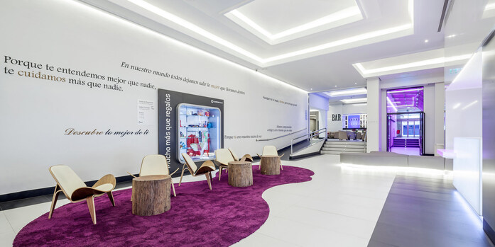 Wenn es auf den ersten Eindruck ankommt, bleibt uns das Hotel Ilunion Suites Madrid wie ein Ausbruch an Verwegenheit und Frische, die uns nicht unberührt lassen, prägend in Erinnerung. Zu dem spektakulären Eingang, bei dem die PORCELANOSA-Gruppe mit ihrem Solid Surface KRION® mitgewirkt hat, kommen die hervorragende Lage (C/Lopez de Hoyos 143, in unmittelbarer Nähe des Paseo de la Castellana und des Fußballstadions von Real Madrid, Santiago Bernabéu) im nordwestlichen Teil Madrids und seine 152 Zimmer mit Wohnzimmer hinzu, wodurch das Hotel zu einer der besten Optionen für Geschäftsreisende in der spanischen Hauptstadt wird.