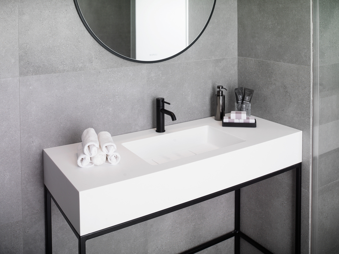 Made of 1100 Snow White KRION™, SLANT comes in a 48x28cm and 38x28cm format to suit bathrooms of all kinds. It stands out for its rectangular KRION® drain trim, which conceals the drain and ensures visual continuity with the rest of the washbasin. Its identical sloping sides make it easy to fit in countertops, while also ensuring functionality and design appeal.