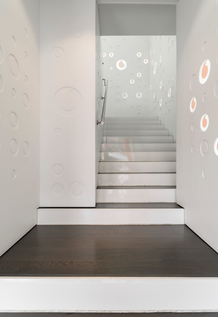 Ein Teil der Ladeneinrichtung wurde aus KRION® hergestellt, aber wir möchten die spektakulären, aus KRION® gefertigten und von 3G Office entworfenen Wände hervorheben, die als Flachrelief bearbeitet wurden und die Vodafone per Hausautomatisierung beleuchtet. Auf diese Weise werden eine Reihe von Szenen geschaffen, in denen das Firmenlogo aufleuchtet, darunter sogar eine, die mit den berühmten Glockenschlägen zum Jahreswechsel interagiert.
