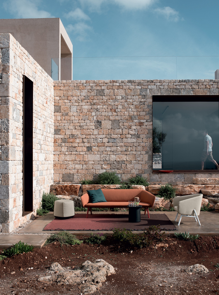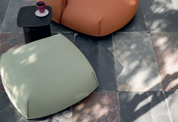 Brioni ist eine Kollektion, die ihren Namen von einem berühmten Archipel in der Adria erhält, da auch die Poufs, Lounge-Stühle und Daybeds wie kleine Inseln aus dem Meer ragen. Das Design zeichnet sich durch den dunklen Streifen im unteren Bereich aus, der den direkten Kontakt zwischen dem Boden und dem Bezug verhindert. Der Bezug ist aus Stoff Sunbrella® gefertigt: eckenresistent, atmungsaktiv, UV-beständig und wasserabweisend. Die Sitzmöbel sind dank der exiblen, in eine wasserdichte Hülle eingeschlossenen Polsterung aus Polyether und Kunststoffriemen weich und komfortabel.Sie lassen sich leicht und mühelos umstellen und ermöglichen durch die Kombination von unterschiedlichen Formen, Farben und Größen unzählige Zusammenstellungen für das Leben im Freien.