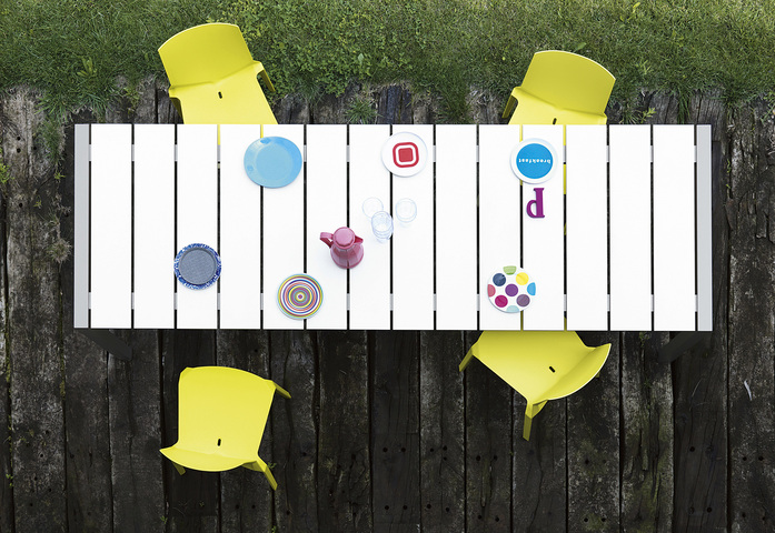 Die Platte besteht aus dünnen Leisten aus Fenix-NTM®: Ein Material mit einer warmen und berühungsfreundlichen Ästhetik, das Leichtigkeit, Stärke und Widerstandsfähigkeit gegen Witterungseinflüsse vereint. Die Struktur ist aus eloxiertem Aluminium gefertigt, einem umweltfreundlichen und für die Verwendung im Freien geeigneten Material. Neben einer reichhaltigen Auswahl von Tischen in verschiedenen Größen umfasst die Kollektion auch eine dazu passende Bank, die als Sitzmöbel oder vielseitiges Einrichtungselement genutzt und mit dem abnehmbarem Kissen Lips ergänzt werden kann.