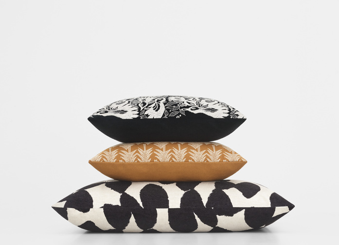 An exceptionally detailed cushion with a particularly sophisticated look, Carnival’s delicately crafted pattern brings together birds, leaves and abstract floral motifs. These are precisely embroidered with white cotton yarn on to a densely woven, black woollen crêpe base.