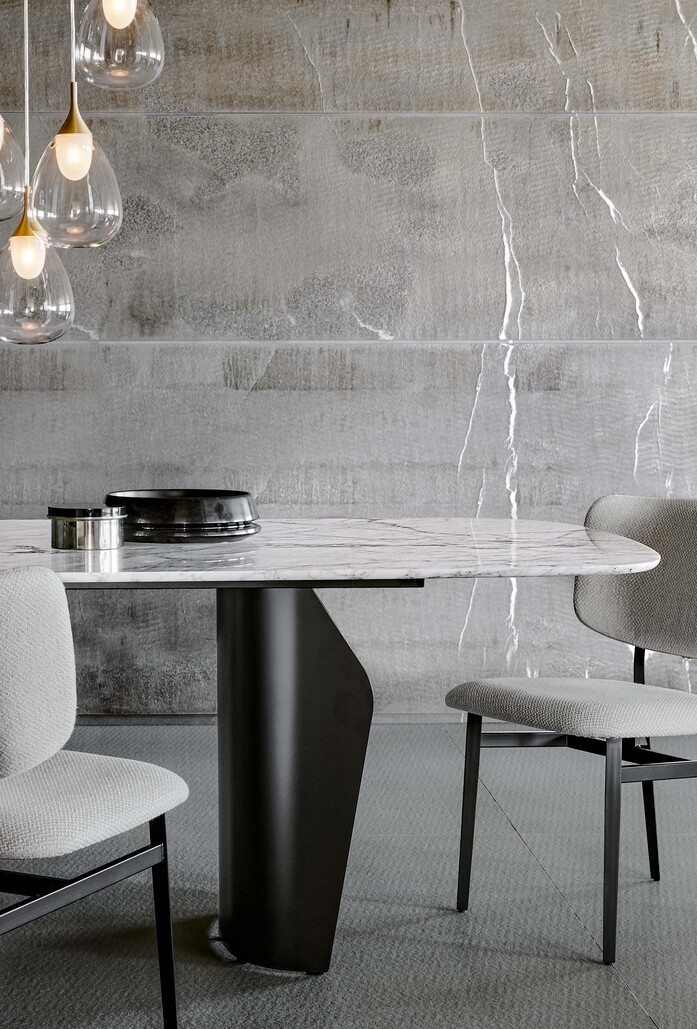 Die einzigartigen Designelemente der Kollektion entfalten sich und formen sinnlich erfahrbare und subtile Übergänge. Dieser Effekt wird durch die Überlagerung mehrerer differenzierter Fertigungsprozesse erzielt. So gehen in der Kollektion dicht gewebte leuchtende Farben in Transparenz über, schimmernde Oberflächen folgen auf natürlich, matte Gewebelagen, und dreidimensionale Texturen und papierartige Effektgarne erzeugen atmosphärische Kontraste.
