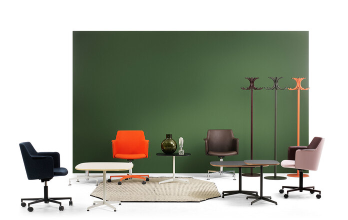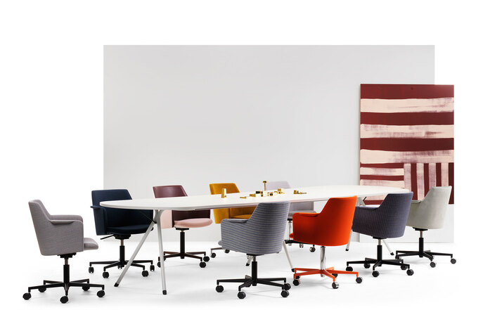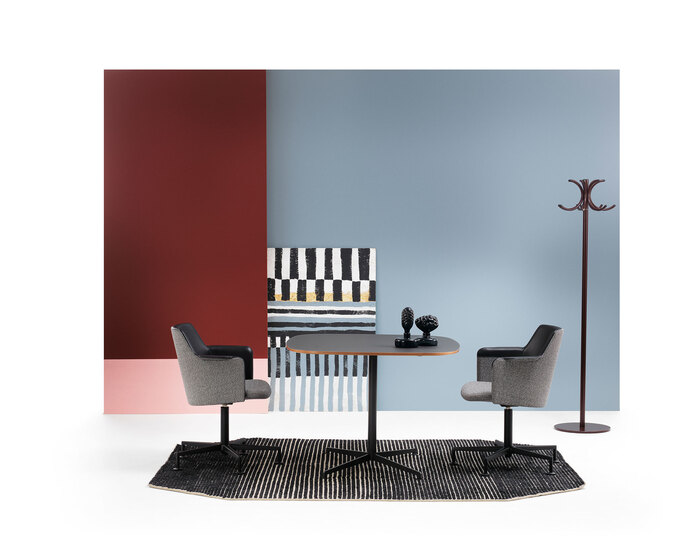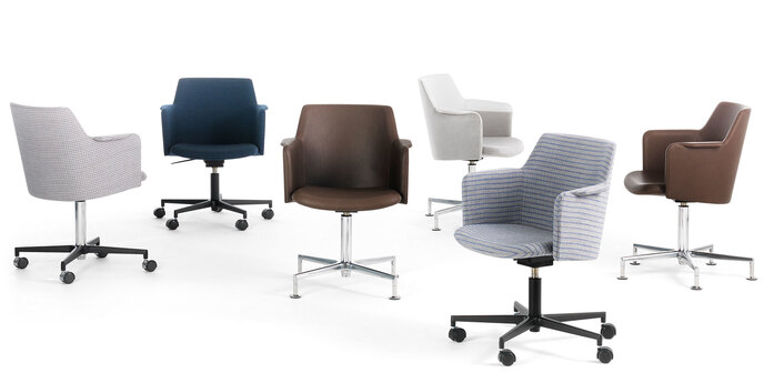 Gunilla Allard took her inspiration for the chair from the Sixties-setTV show, Mad Men. Not only the design but also the upholsteryreflects this ethos, as the covering on Carousel has distinct parallels tothe smart work fashions of the 1960s. The upholstery can also betailored by combining different fabrics and leather. The permutationsare endless, enabling a wide variety of looks.