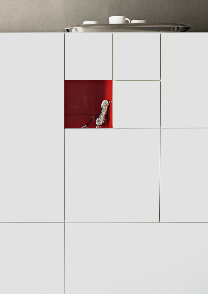 The linearity of the container is interrupted by a succession of squared doors and drawers shrinking in a perfect spiral that ends with a void space, the origin and end of this movement.