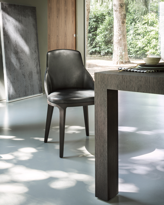 Elegant and refined, with a timeless allure, it stands out for the solid wood structure and cosy and harmonious forms of the seat proposed with leather upholstery with busted out stitching that underscore Lema’s tailoring approach. The comfortable padding adds to the softness.