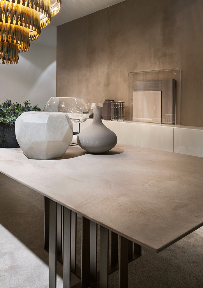 Francesco Rota designs the Shade table, a harmonious combination of bronzed metal at the base and the slender top in contrast. The generous measurements of this elegant dining table (250 cm and 350 cm in length) make it the perfect room centrepiece: the sculptural pedestal is formed by delicate sheets of treated metal arranged crosswise asymmetrically; it is the interplay of lights and shadows of the metal grill which gives it its name. The tabletop is available in wood and in the smooth Clay finish, completing the beauty of this important piece of furniture.